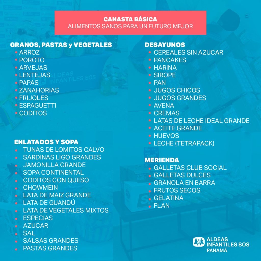 Aldeas Infantiles SOS Panamá invita a empresas y personas de buen corazón a sumarse a su campaña de donación de alimentos, vigente del 26 de enero al 28 de febrero, a través de los carritos solidarios ubicados en las principales sucursales de Super 99 en Panamá (El Dorado, Albrook Mall, San Francisco, Costa del Este y Los Pueblos), Chiriquí (San Mateo y Plaza Corotú), Coclé (Penonomé y Aguadulce) y Panamá Oeste (El Coco).